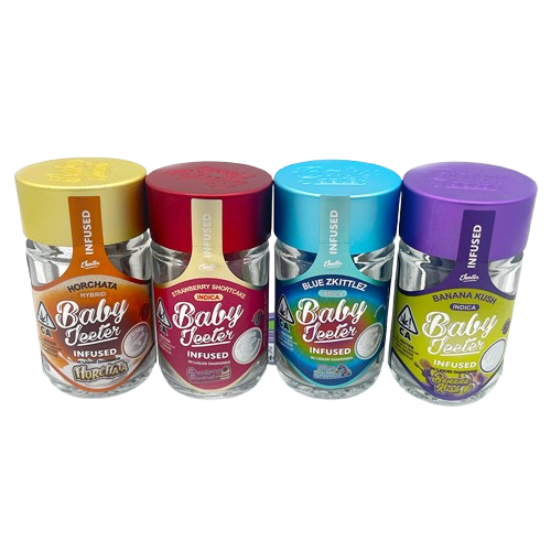 In each jar, you'll find a hand crafted, hand rolled 5 0.5-gram Jeeter joints. They're made with premium indoor grown flower, infused with Liquid Diamonds in California and Michigan or distillate oil in Arizona, and dusted in kief. 5-minute burn time each.